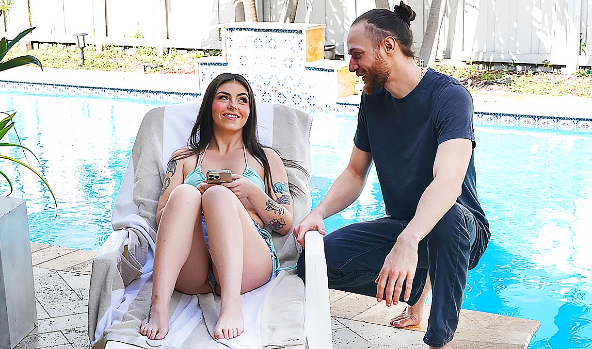 Летом, когда жарко, то работать нет ни желания, ни какой-либо возможности. Вот поэтому симпатичная подружка проводит все время в прохладе у бассейна, а когда поблизости появляется товарищ, то пытается скинуть его в бассейн или просто пококетничать перед тем как соблазнить на секс в доме!